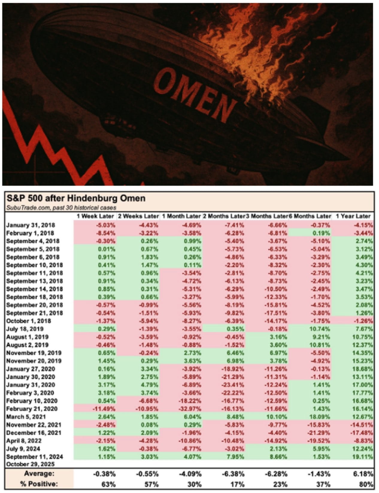 興登堡預兆的羣集……2025年10月17日和30日……已經點燃。這是與1987年崩盤、2000年互聯網泡沫破滅和2008年金融崩潰之前相同的信號。77%的歷史概率指向5-20%的標準普爾500指數暴跌,威脅到4-6萬億美元的股權消失。但比特幣站在十字路口。