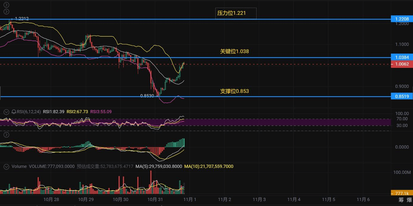 當前價格:1.006美元,正卡在關鍵位1.038下方。這就像爬山快到山頂了,只要衝過去,就能看到更美的風景。