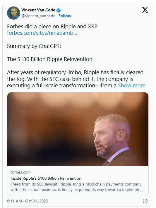 Vincent Van Code 的 X 帖子突顯了 Ripple 轉型為加密基礎設施領導者及其在機構市場中日益增長的影響力。