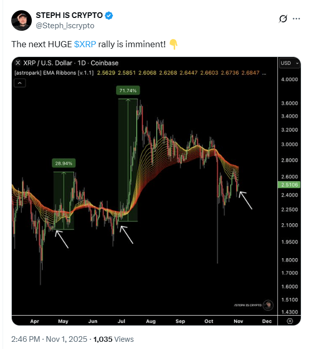 加密交易者 STEPH IS CRYPTO 最近的圖表分析顯示,XRP 在日時間框架上遵循一個可識別的結構。該模式圍繞 EMA(指數移動平均)帶展開——這些彩色帶幫助識別趨勢強度和潛在的反轉。