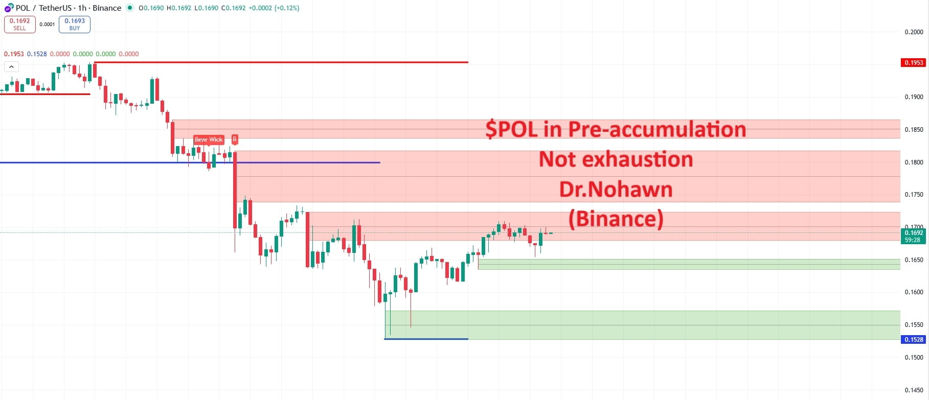 如果這對主導地位開始同步回落——比特幣穩住地盤,而穩定幣主導地位下降——我們可以預期POL將受益於輪換流入,測試接近0.175 – 0.180 USDT的阻力區域,作為恢復的第一階段。在1.5M以上的持續交易量和改善的MACD結構將確認這一過渡。