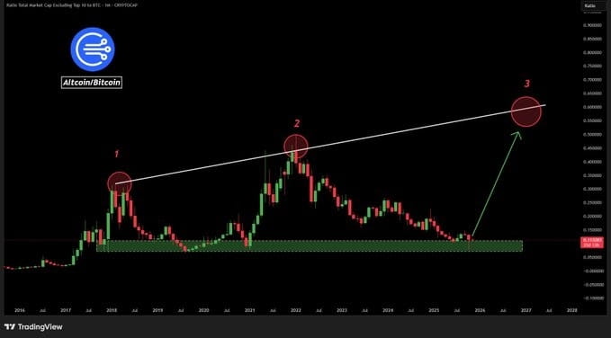 現在,在大多數人從未關注的加密貨幣技術圖表的深處,類似的事情正在發生。山寨幣與比特幣的比率——一個聽起來很無聊的指標,直到你理解它對你的投資組合意味着什麼——剛剛從一個在加密歷史上只觸碰過兩次的水平反彈。兩次之後,隨之而來的不僅僅是一次反彈。這是一場使百萬富翁橫空出世並重塑整個加密貨幣格局的革命。