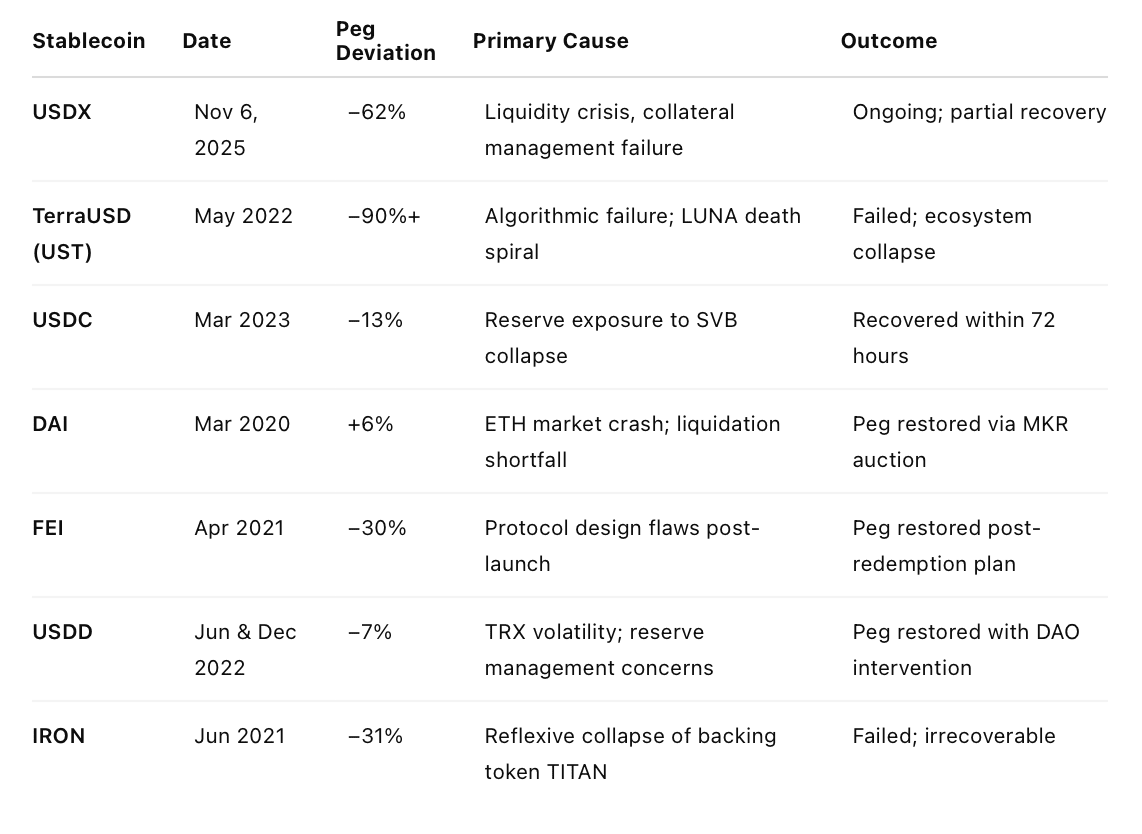 USDX 的崩潰增添了穩定幣失敗的歷史,這些失敗挑戰了美元掛鉤數字資產作為安全避風港的認知。以下是主要穩定幣脫鉤的比較分析、原因及結果。