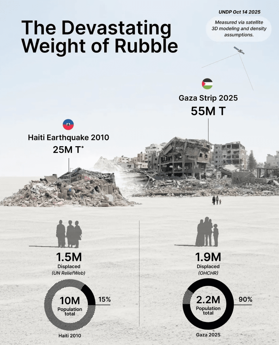 2025年10月發佈的聯合國開發計劃署和聯合國衛星分析測量了加沙地帶大約5500萬噸的廢物,這些數據來自3D體積建模和材料密度估算——這是聯合國實時進行的最全面的損害映射。