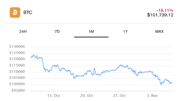 近期,市場避險情緒明顯升溫。部分資金從加密市場流向黃金等傳統避險資產,顯示出全球風險偏好正短線下降。隔夜,比特幣最低跌至 100,420 美元,隨後略有反彈至 101,000 美元 附近。過去一週累計跌幅近 7%,距離10月創下的歷史高點126,080美元已回調超過 19%。分析人士認爲,這一輪下行,更多反映了宏觀經濟不確定性、市場流動性緊張以及投資者風險偏好下降等多重因素的疊加。