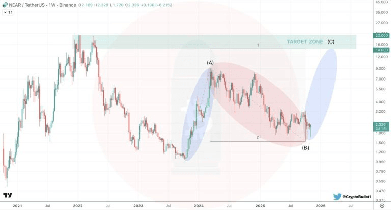 NEAR/USDT 的周線圖勾勒出一個更大的 A-B-C 波浪結構,表明代幣可能接近其修正階段的尾聲。根據該模式,目前約 $2.32 的價格標志着點 (B)—一個潛在的反轉區,從這裏新的上升波浪可能開始。預計的目標區間 (C) 位於 $14 和 $20 之間,表明如果看漲結構展開,可能從當前水平上升 6 倍到 8 倍。這與長期恢復設置相一致,而不是短期反彈,使 NEAR 成爲未來幾個月最值得關注的中型市值代幣之一。