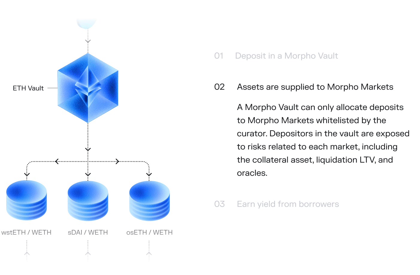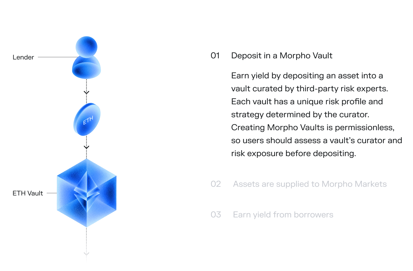 收益開始於貸款人決定將資產——ETH、穩定幣或代幣化抵押品——存入 Morpho Vault 的那一刻。每個 vault 由第三方風險專家策展,他們定義了如允許市場、預言機和抵押比率等參數。這意味著即使在資金部署之前,風險也在 vault 層面進行過濾。