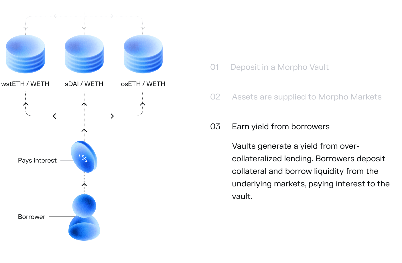 一旦流動性被部署,借款人將利息支付回 vault。這些利息形成貸款人收到的收益。每個 vault 都通過超額抵押的貸款產生收益,這意味著借款人必須始終鎖定比他們借入的價值更多的資產——減少系統性風險並使系統自然具備償付能力。