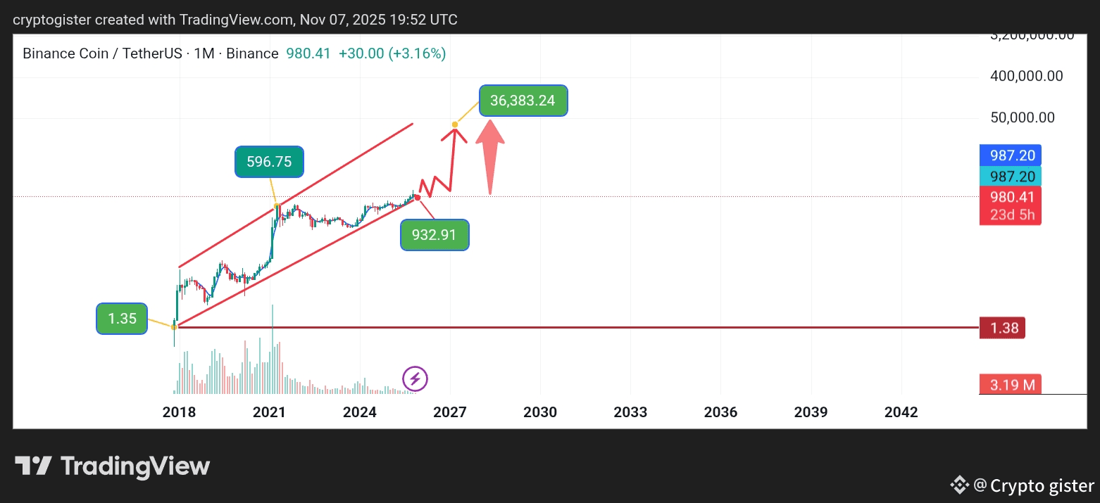 This trend began around $1.35 during Binance’s early trading era. That initial consolidation phase set the foundation for a multi-year ascending channel that still defines BNB’s long-term direction today.