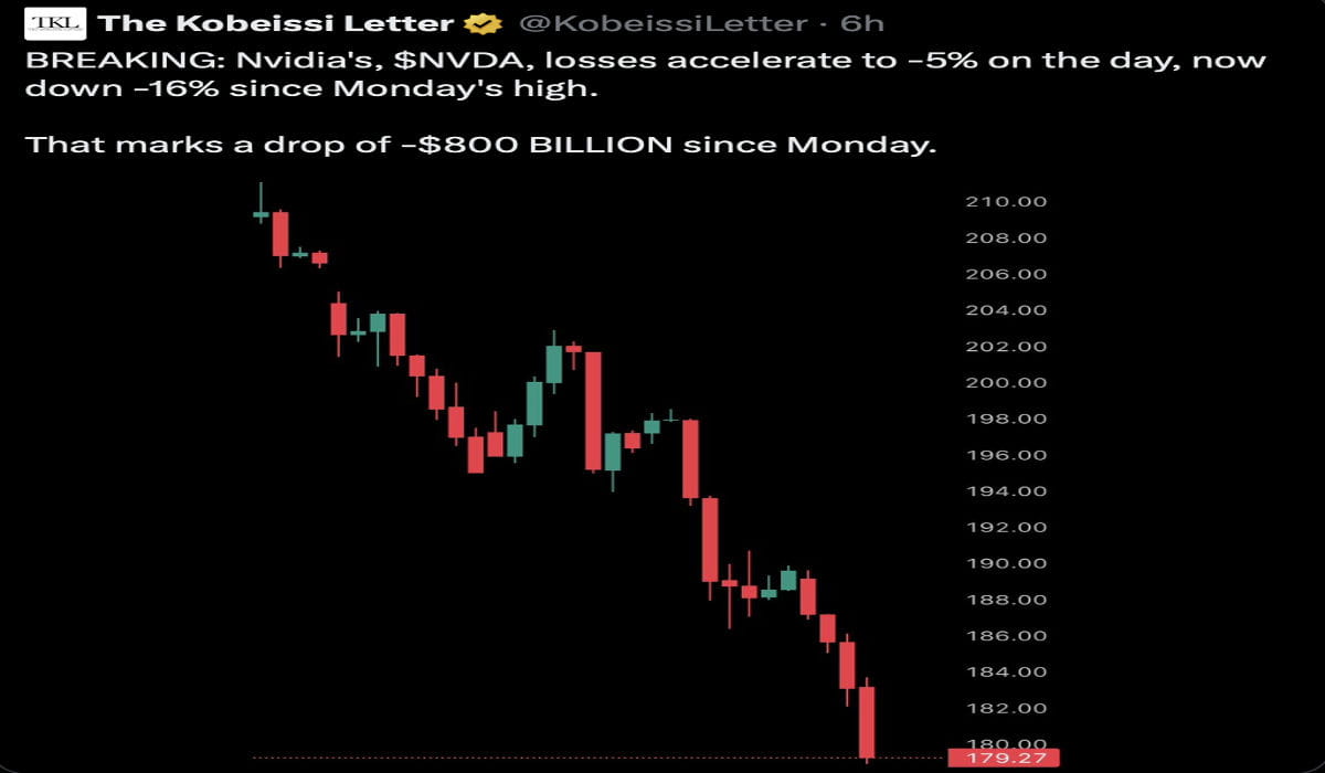 週一,英偉達的市值達到了巔峯。週五,它已經抹去了8000億美元。不是幾個月,而是四個交易日。