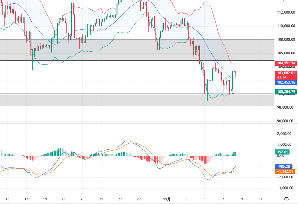 比特幣昨晚再次試探了10萬關口後反彈回升,早間回到了104000附近承壓下來,現在103000附近徘徊,短線算是維持震盪小幅回升,基本上走勢跟我昨天給出的區間支撐和阻力完全一致。目前比特幣的走勢情況還是上漲缺動力,下跌有支撐,這樣的僵局也是正常的,正如我這幾天多次說過的一樣,在這個區間位置附近肯定會反覆拉扯的。眼下反彈過程中的阻力區還是在之前分析說的105000-108000區域,支撐依然集中在100000 -99000位置。