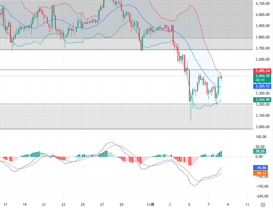從技術角度看,ETH 在下方關鍵支撐區被多次測試,短線會有買盤防守,但上方突破阻力也不輕鬆。整體節奏感覺還是像是在“觀望窗口期”,所以即使有反彈依然還不強勢,今天日內看承壓區3500-3450修正情況,短期支撐3320-3270。這輪反彈重要阻力區還是之前說過的3500-3800區域,如果這個週末能穩住3400-3350上方,那麼下週可能會去延續反彈測試3500-3800區域。