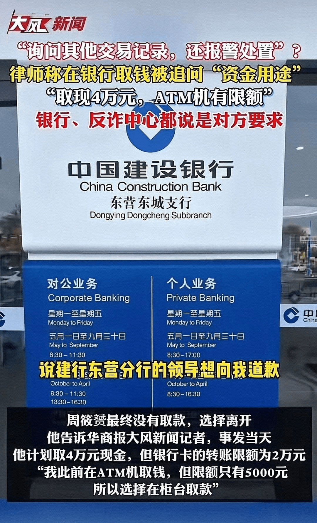 據大風新聞報道,知名律師周筱贇近日赴山東東營出差。因急需現金,他於11月3日前往中國建設銀行東營東城支行辦理取現業務。本以爲是一次簡單的業務辦理,卻遭遇了一場始料未及的“取款風波”。