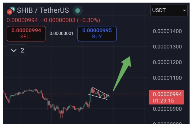 ⬤ 圖表顯示 SHIB 在 $0.00000994–$0.00000995 附近緊密整合,形成明確的楔形模式,顯示出波動性降低。圖表上的一個大綠箭頭指向上方,反映出交易者對即將突破的預期。對於關注 SHIB 幣新聞的人來說,這種壓縮通常暗示著在更大的方向性移動之前的積累—特別是當動量確認時。