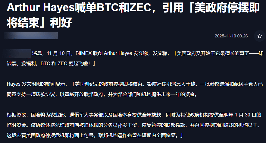 重大利好來襲!Bit創始人Arthur Hayes直接喊單BTC,背後是美國政府停擺危機解除的超級利好!聯邦機構重啓,印鈔機又要轟鳴,歷史經驗告訴我們,這種宏觀放水就是加密貨幣的火箭燃料。