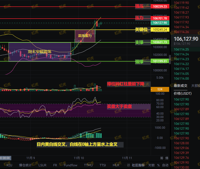 1小時K線圖顯示,BTC突破10.36w支撐後,強勢拿下關鍵位10.52w,現在正試探10.67w壓力區。