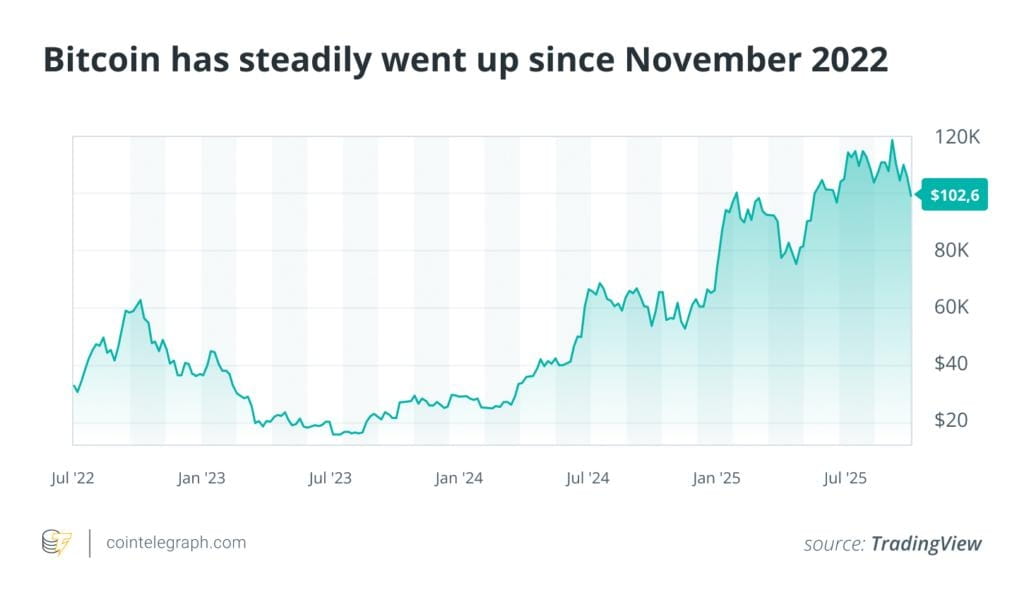 比特幣於2024年12月5日首次超過100,000美元的關口,達到103,679美元。此後,它多次跨越此水平,在2025年10月記錄的最高估值超過125,000美元。