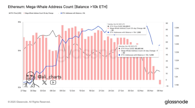 最近的鏈上數據顯示,以太坊最大的 23 隻鯨魚在過去一週內減少或轉移了他們的持倉。數字清楚地講述了一個故事:巨型鯨魚地址從 11/4 的 1,262 減少到 11/8 的 1,239。這在短短幾天內的顯著下降以及 30 天變化指標的急劇下降確認了這不僅僅是噪音——這是一個可測量的大持有者行為的轉變。