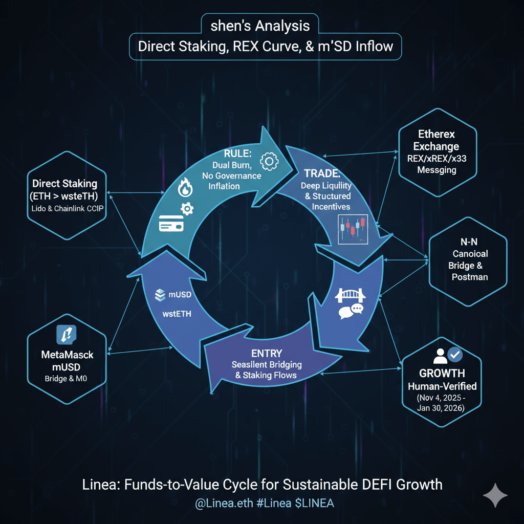 如果你今天在測試:從直接質押(ETH→wstETH)開始,嘗試mUSD→Linea→交換,在Etherex上放置小位置,並探索Exponent以發現活躍項目。一旦你這樣做,你會明白為什麼Linea的“資金到價值”循環正在成為可持續DeFi增長的新標準。