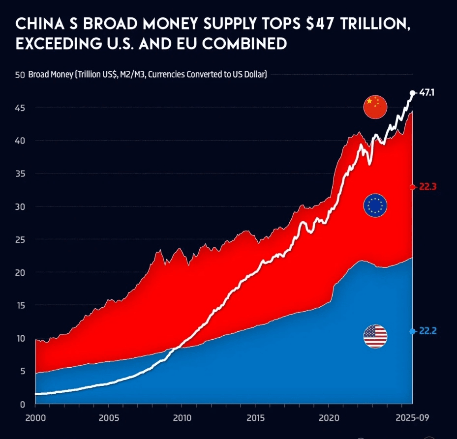 中國的廣義貨幣供應量(M2)在2023年9月達到了39.7萬億美元,首次超過了美國和歐盟的總和(39.6萬億美元)。到2025年9月,中國的M2進一步擴大至47.1萬億美元,比美國(22.2萬億美元)和歐盟(22.3萬億美元)合計的44.5萬億美元高出5.9%。這反映了中國金融體系和信貸基礎相對於西方經濟體的持續快速擴張。