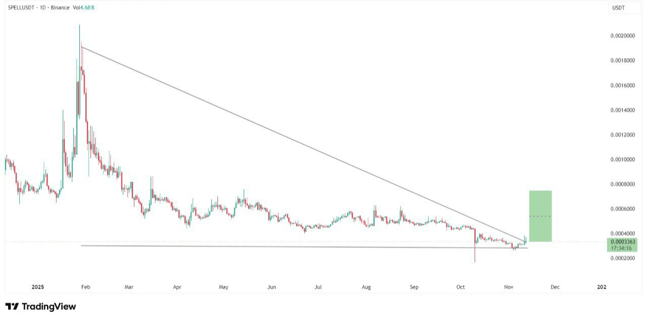 最終突破自由 🔓 — $SPELL 在經過幾個月的壓縮後,已經突破了其長期下行趨勢線 📉➡️📈。