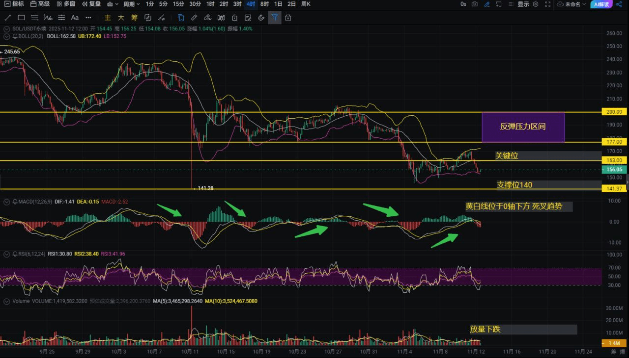 今天SOL的行情,就像坐過山車,4小時圖上綠油油一片,但暗藏殺機!MACD白黃線掉到0軸下方,死叉來了——這可是看空的致命信號啊!行情到底會衝上163的關鍵位,還是反彈到177的壓力位?又或者,直接砸到140的支撐位?消息面突然爆出Upexi公司業績創紀錄,質押收益610萬美元,但這利好能救市嗎?散戶該怎麼操作?別急,神策用大白話帶你一步步拆解