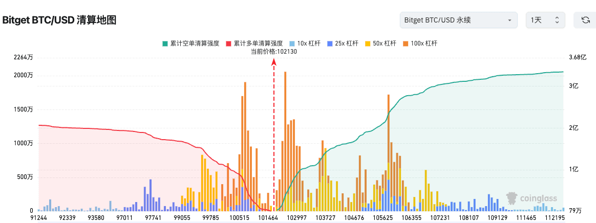 3、Bitget BTC/USDT清算地圖顯示,當前清算壓力集中於多頭關鍵支撐位下方,空頭清算分佈較廣,短線市場波動增強,關注支撐穩固與反彈跡象;