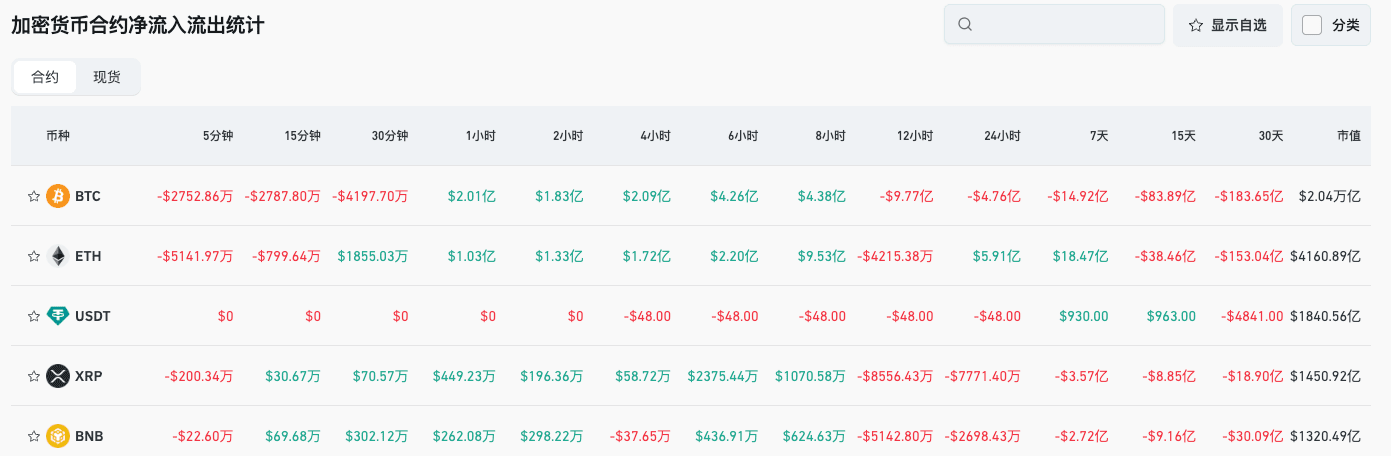 5、過往 24 小時內,BTC、ETH、USDT、XRP、BNB 等幣種合約交易淨流出領先,或存在交易機會;