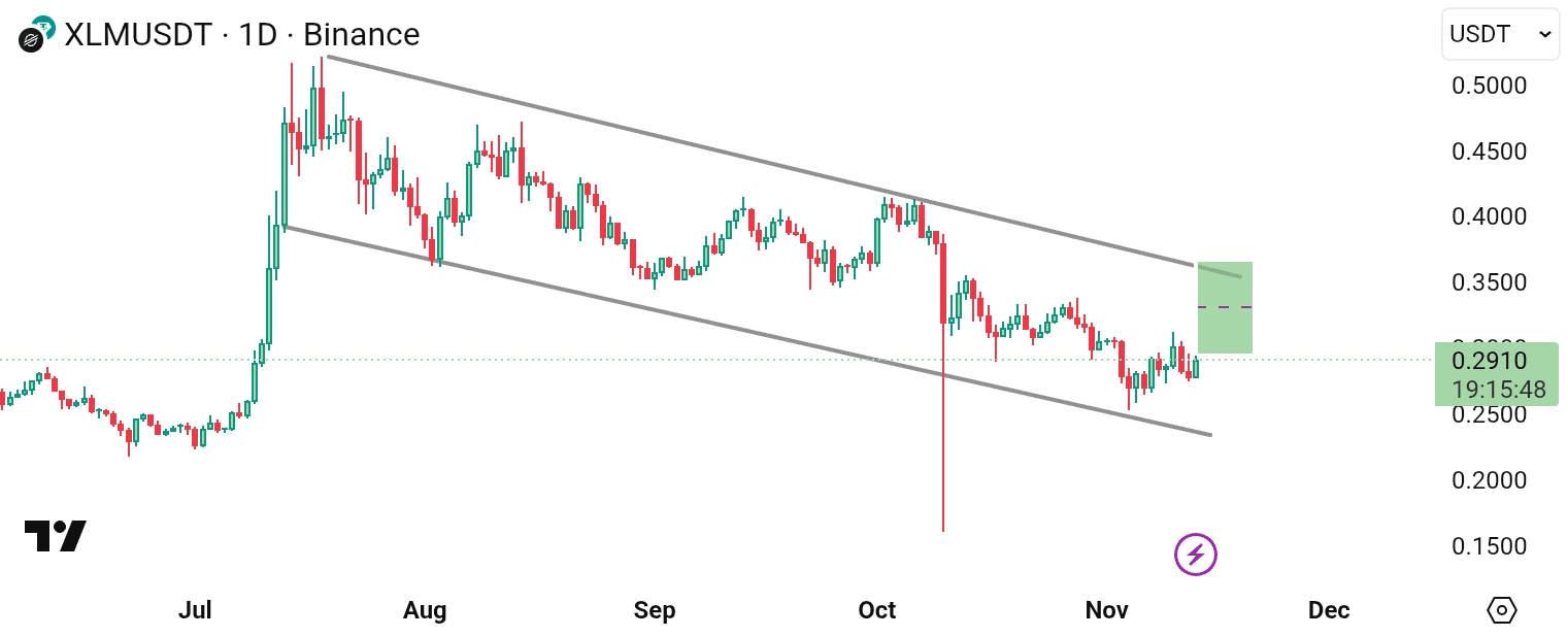 $XLM 在日線時間框架內交易於明顯的下降通道📉——目前保持在0.2910 USDT的下方支撐附近🧠。