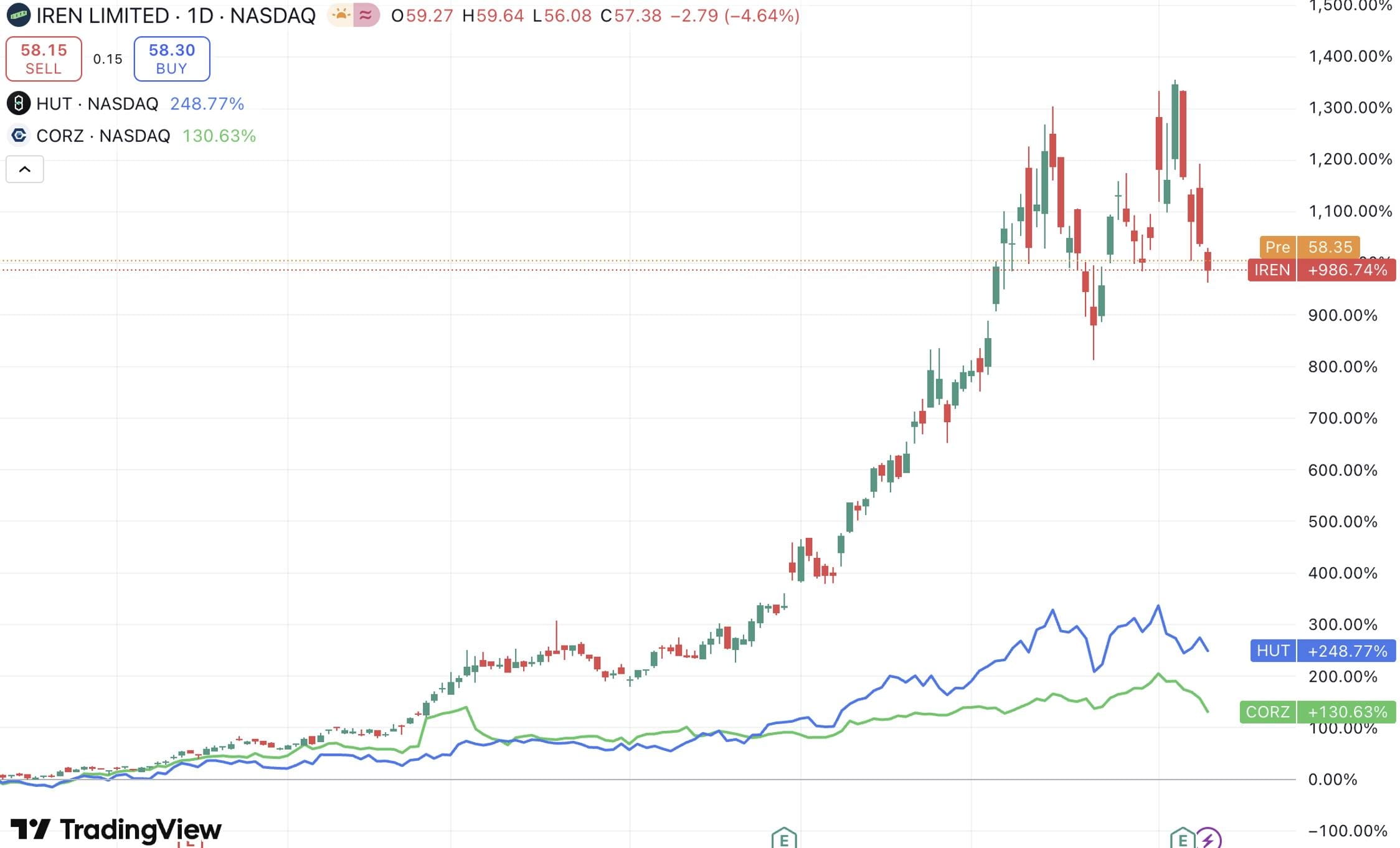 圖:IREN年內上漲987%,HUT年內上漲249%,CORZ年內上漲131%