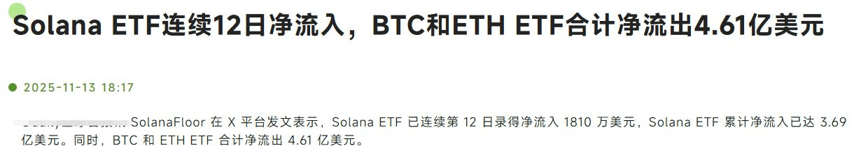 剛剛的這消息讓人震驚:Solana ETF連續12天吸金3.69億美元,而BTC和ETH ETF卻血流成河,單日淨流出4.61億美元!這不僅僅是數字的遊戲,更是大資金在用腳投票!背後的信號再明顯不過:機構正在重新佈局,而你,是否還沉浸在"牛市歸來"的美夢中?