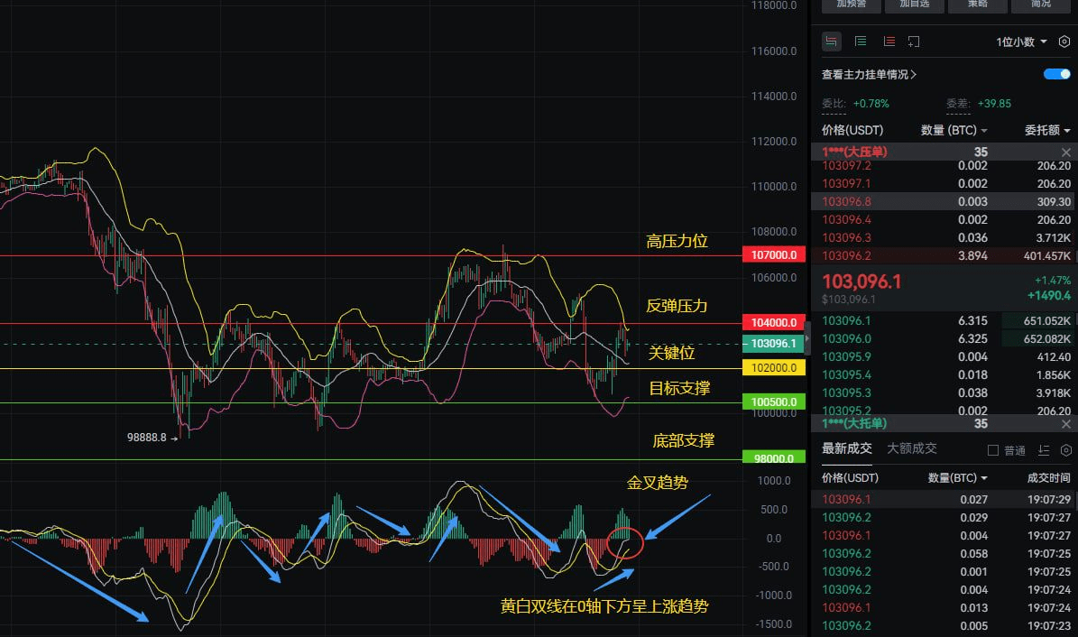 打開一小時K線圖,一個詭異的畫面出現了:MACD金叉向上,但價格卻被死死壓在104000下方。這種"技術面背離"往往意味着更大的風險!重點關注三個位置: