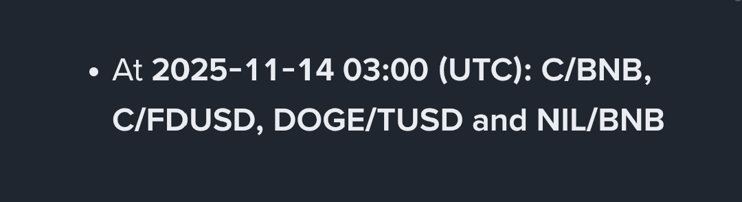 在2025-11-14 🕒03:00(UTC) :C/BNB,C/FDUSD,DOGE/TUSD & NIL/BNB ❌🚫🚨📢📢📢📢. #DelistingAlert #spotdelisting #viralpost #BinanceVietnamSquare #PowellWatch $NIL $DOGE $C