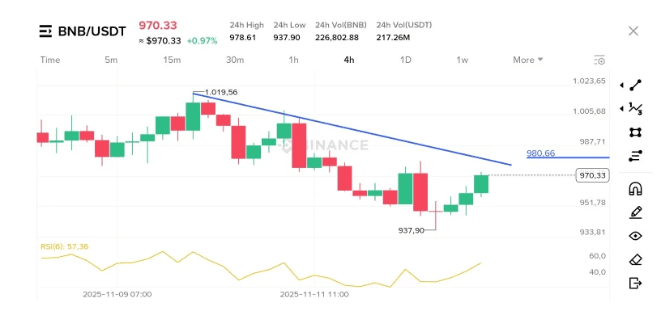 ⬤ 幣安幣 (BNB) 正在進入一個決定性階段,因爲它接近 4 小時圖表上的關鍵$980阻力位。當前價格結構顯示 BNB 從最近的低點$937反彈,並進入一個關鍵區域,在這裏水平阻力與下降趨勢線相遇。價格目前徘徊在$970附近,買家試圖在數週的下行壓力後重新獲得控制權。