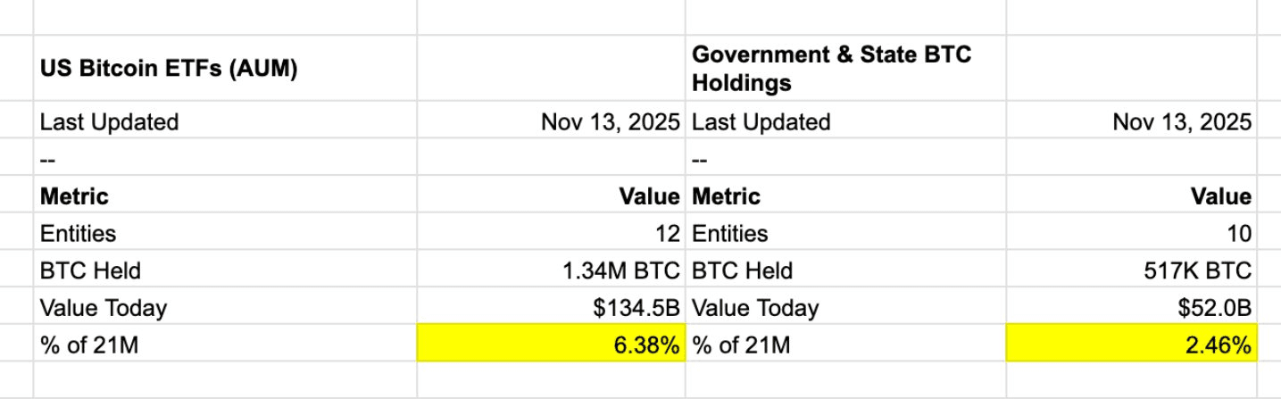 ~9%的所有BTC目前坐落於美國ETF或政府國庫券中;這些都是受監管的、透明的結構,個體主權基本爲零。