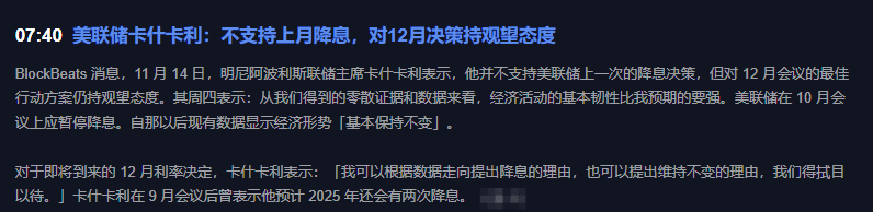 今天凌晨,美聯儲官員卡什卡利突然放話,說不支持上月降息,對12月決策還在觀望。這消息聽起來有點繞,但簡單說就是:美元可能更強,資金可能從高風險資產流出!
