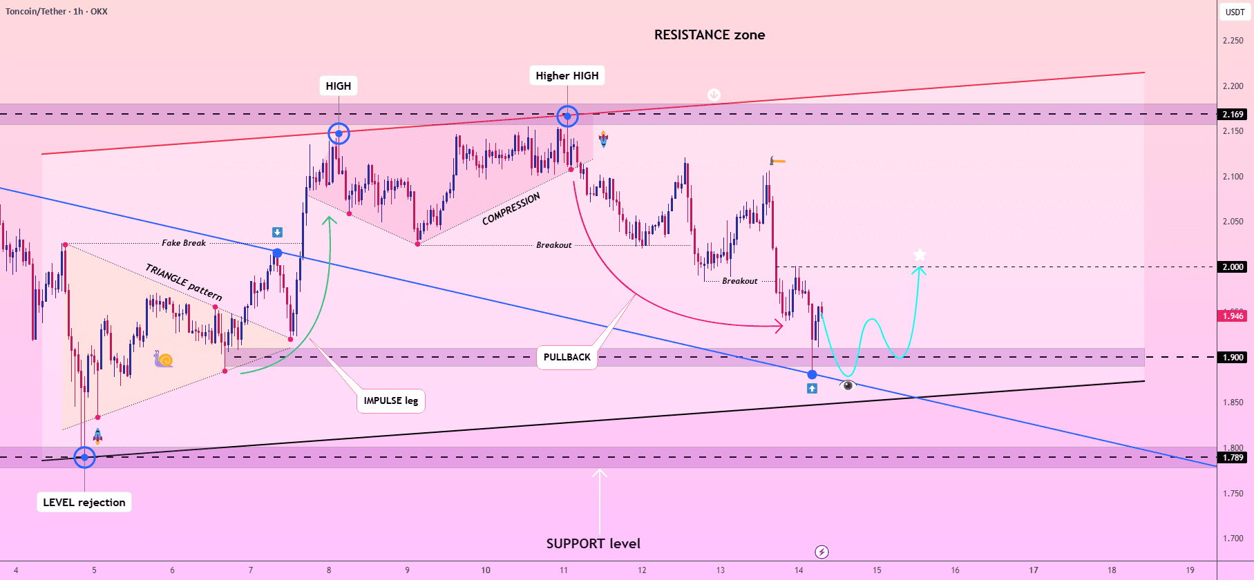 價格完美地實現了我之前的想法。TONUSDT 在從壓縮結構的急劇突破後,正在下跌至支撐區,重新測試下降通道的下邊界。4小時走勢圖顯示價格與長期支撐線和短期下降趨勢線相互作用,形成了一個潛在反彈的匯聚區域。持續保持在1.85以上爲向2.00心理關口的修正反彈鋪平了道路,因爲買家從反應區介入。總體而言,只要支撐基礎保持完好,結構就傾向於短期看漲反彈。