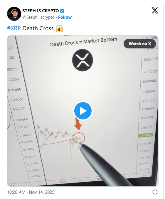 Steph的分析強調了一種逆向觀點。歷史模式顯示,死亡交叉通常標誌着主要反彈之前的低點。在2017年,XRP接近$0.20觸底,後來攀升至$3.84。在2020年,它在COVID崩盤期間觸及$0.11並飆升至$1.96。這種觀點表明當前的死亡交叉可能標誌着一個潛在的底部。