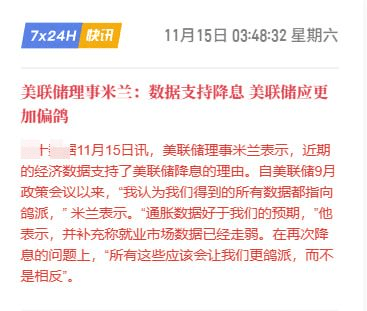 第一,他直接說“所有數據都指向鴿派”,不是“可能”“或許”,是“所有”!要知道,9月他還說“通脹粘性強”,這才倆月就180度轉向,說明連最鷹的官員都被數據打臉了:美國10月CPI降到3.2%,非農就業新增15萬,就業市場真的鬆了!
