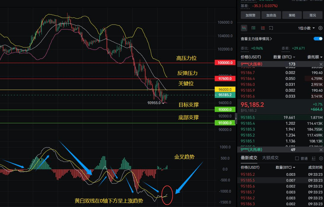 現在BTC一小時圖,價格卡在95000附近,上方標着“反彈壓力97600”“高壓力位10萬”但別急,重點看MACD!