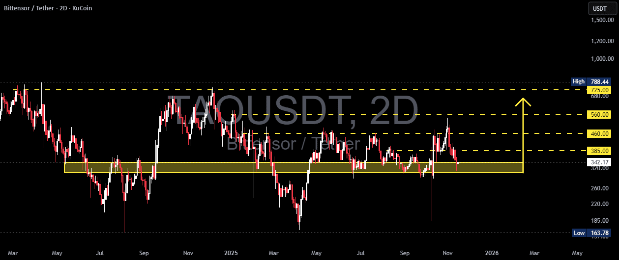 > 如果305–340區域再次被捍衛,TAO可能正在爲多波看漲走勢朝向高位阻力做準備。