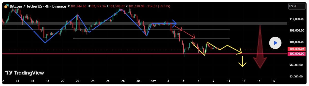 比特幣未能保持$100,000的心理支撐,確認了動能減弱,並提高了更深層次修正波的可能性。
