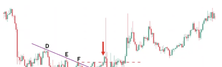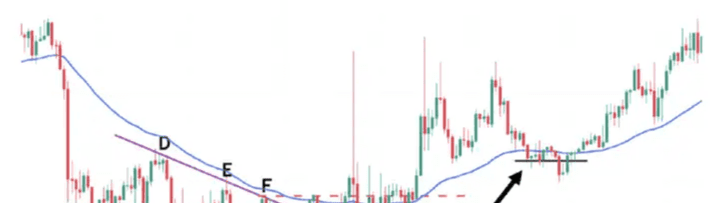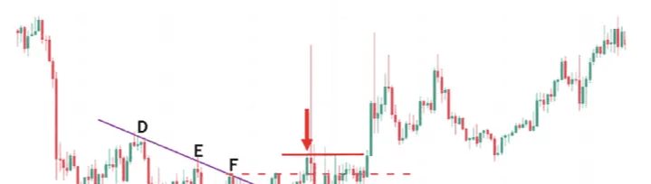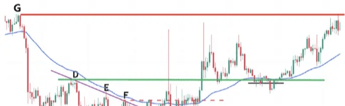 同時連接D點、E點和F點,這是趨勢線,同時我們以F點繪製出水平阻力線。