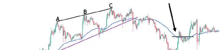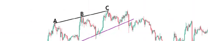 我們可以看到圖中不斷創出新的低點,但是低點的幅度越來越小連接A點、B點和C點,這是通道線。