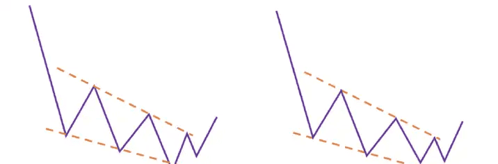 這種形態發生在下降趨勢當中,當價格從底部反彈之後,開始進入收效震盪,隨着價格向下移動,收斂區間變的越來越窄。