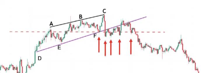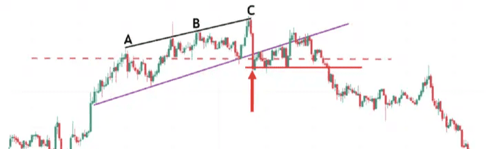 實際上,很多交易員會認爲這個形態的看跌確認要等到向上傾斜的趨勢線被跌破後,纔會可能得到