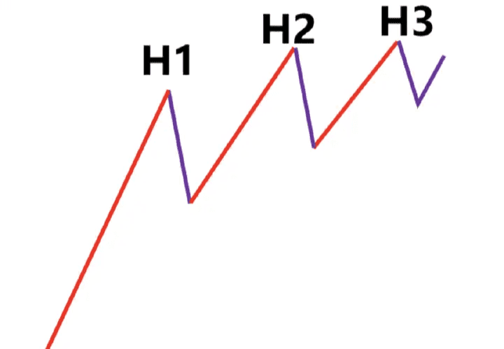 也就是當交易員發現市場的價格向上推動兩次以後,他們就會意識到這可能是一個上升三推楔形的