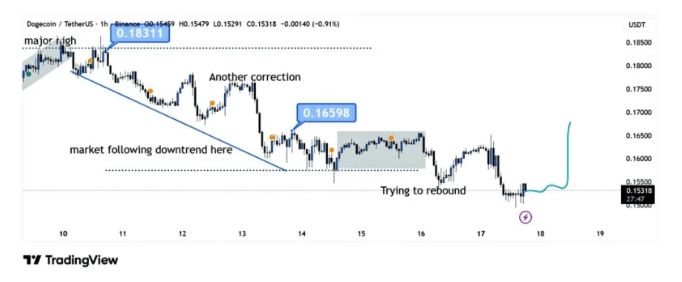 $DOGE 狗狗幣在從$0.183下跌後仍然鎖定在下行趨勢中,當前價格徘徊在$0.153附近,多頭試圖突破附近的阻力位。