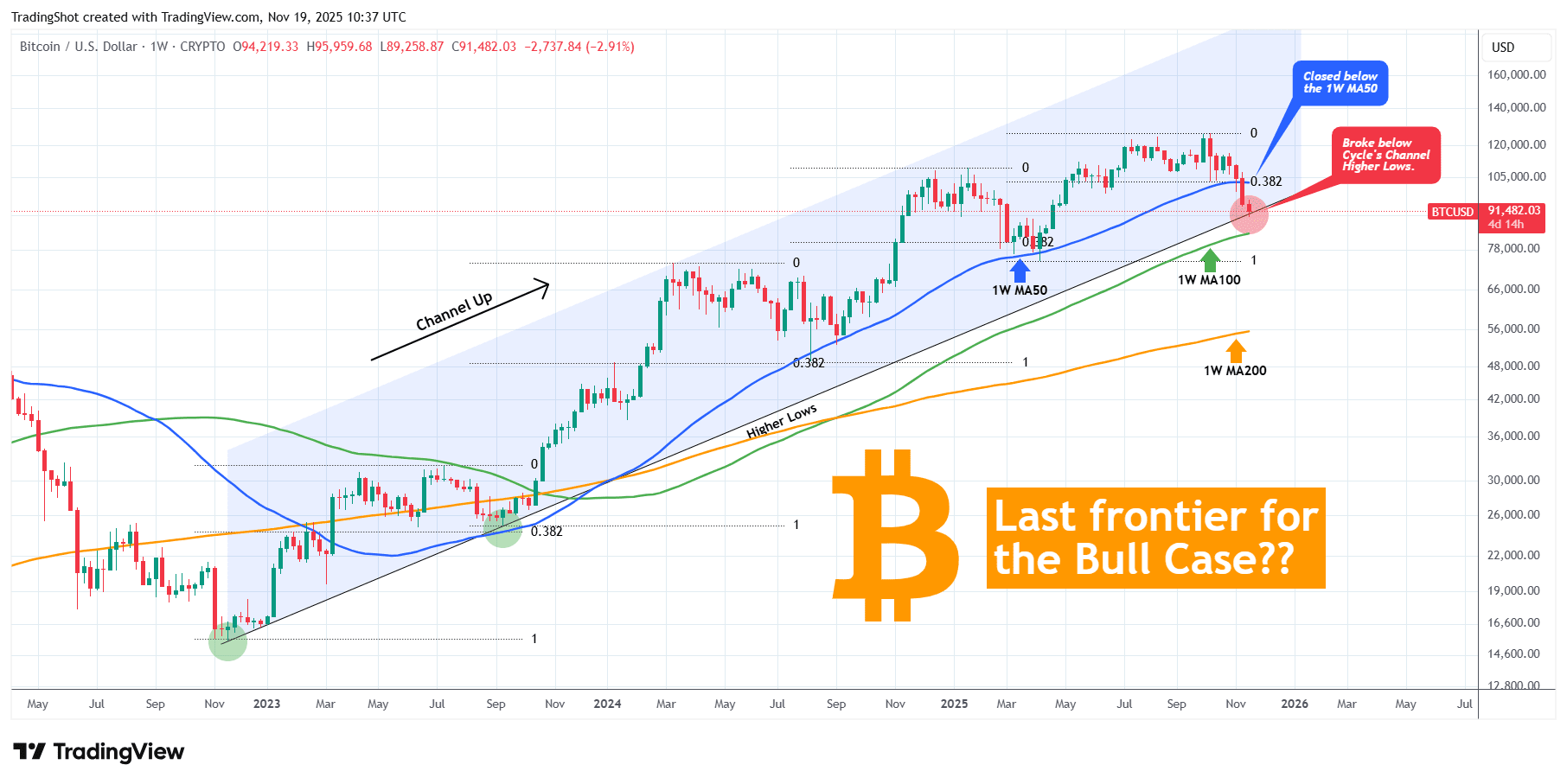 既然我把這個問題解決了,讓我們看看比特幣(BTCUSD)觸及的其他關鍵水平。昨天的劇烈下跌使市場的低點微弱低於3年上漲通道的更高低點趨勢線(底部)。本質上,這一直是整個牛市週期的主導模式。比特幣上週已收盤低於其1W MA50(藍色趨勢線),這在歷史上已被視爲熊市週期的確認,已經通過大幅低於之前更高低點的0.382斐波那契回撤水平,失去了牛市週期反彈的基本結構,現在面臨着模式的完全崩潰——跌破其底部。