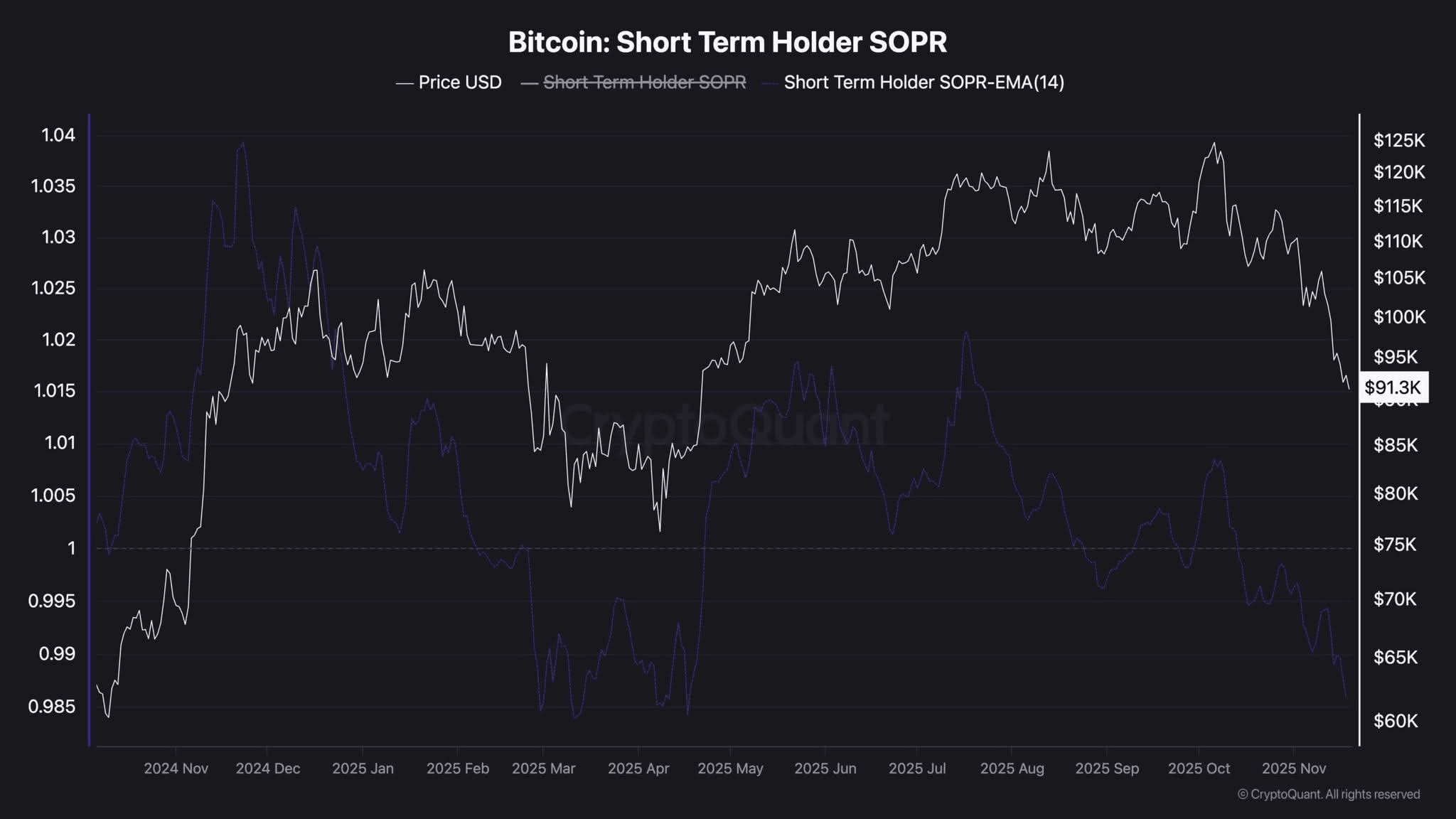 短期持有者SOPR已降至0.97,顯示持續的崩潰。歷史上,這發生在晚期修正中,因為弱手退出,強有力的持有者吸收供應。